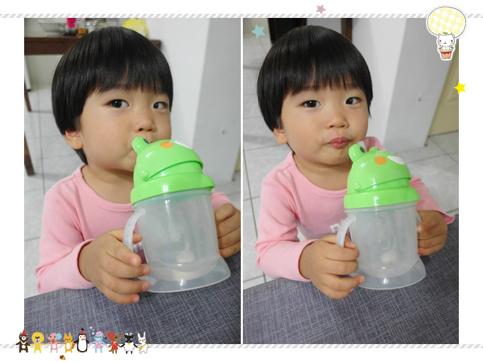 吃完我就把他的青蛙水杯交給他,讓他自己喝水
